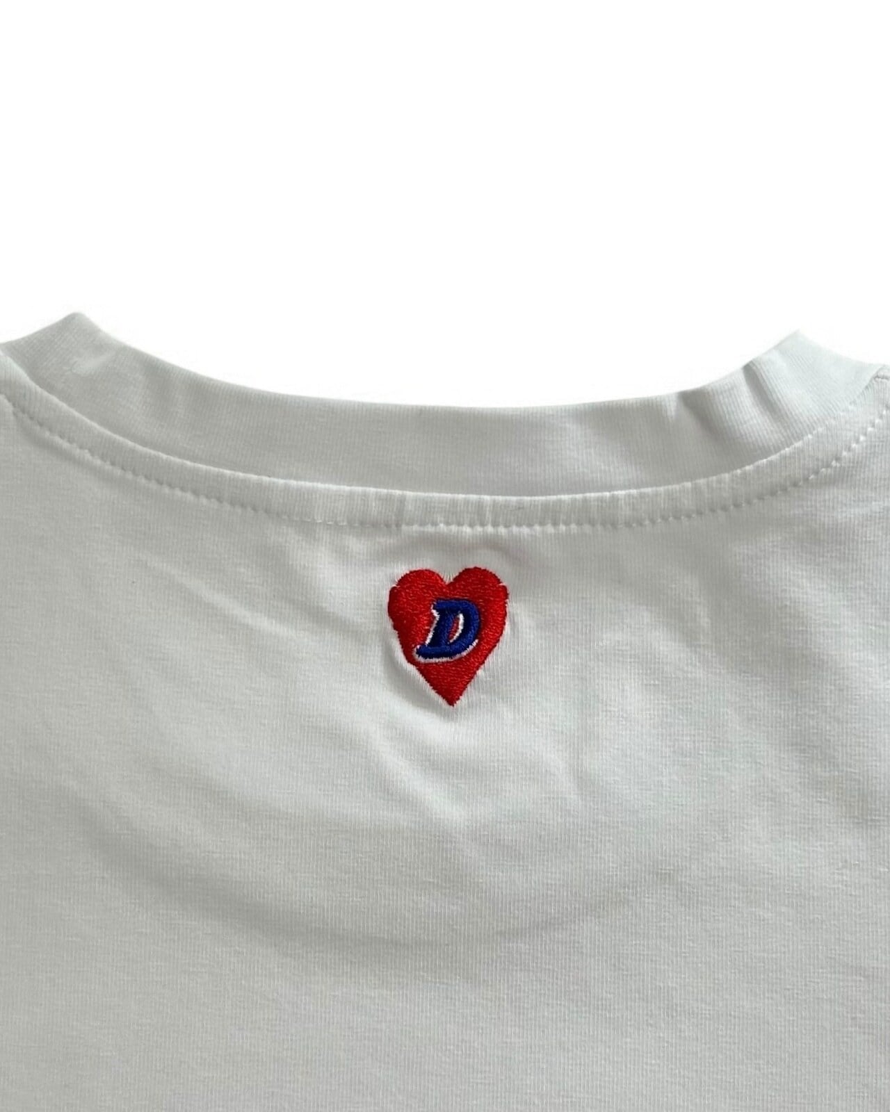 バックスタイルの首元に入れたオリジナルのハートロゴの刺繍がポイント。