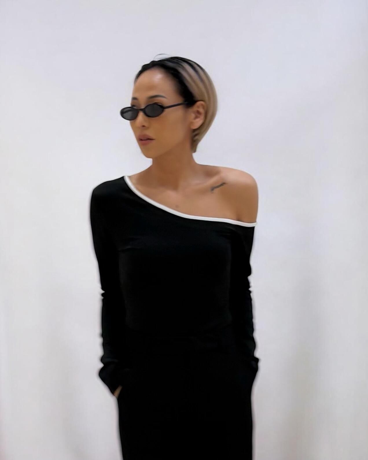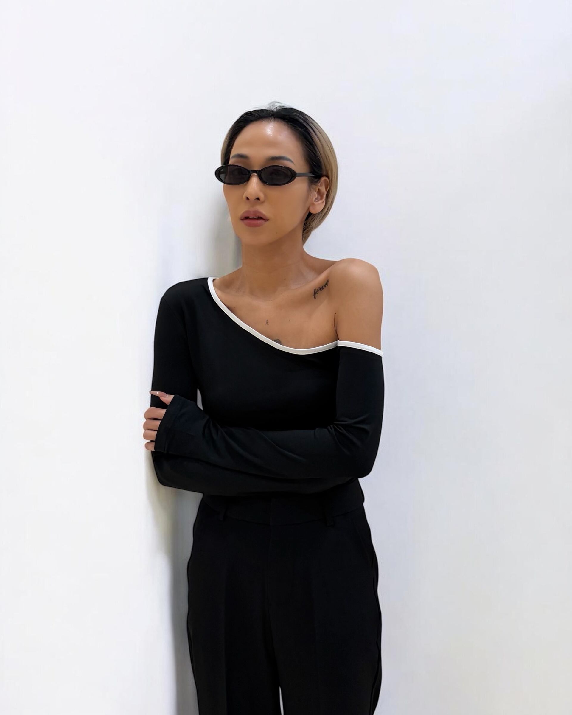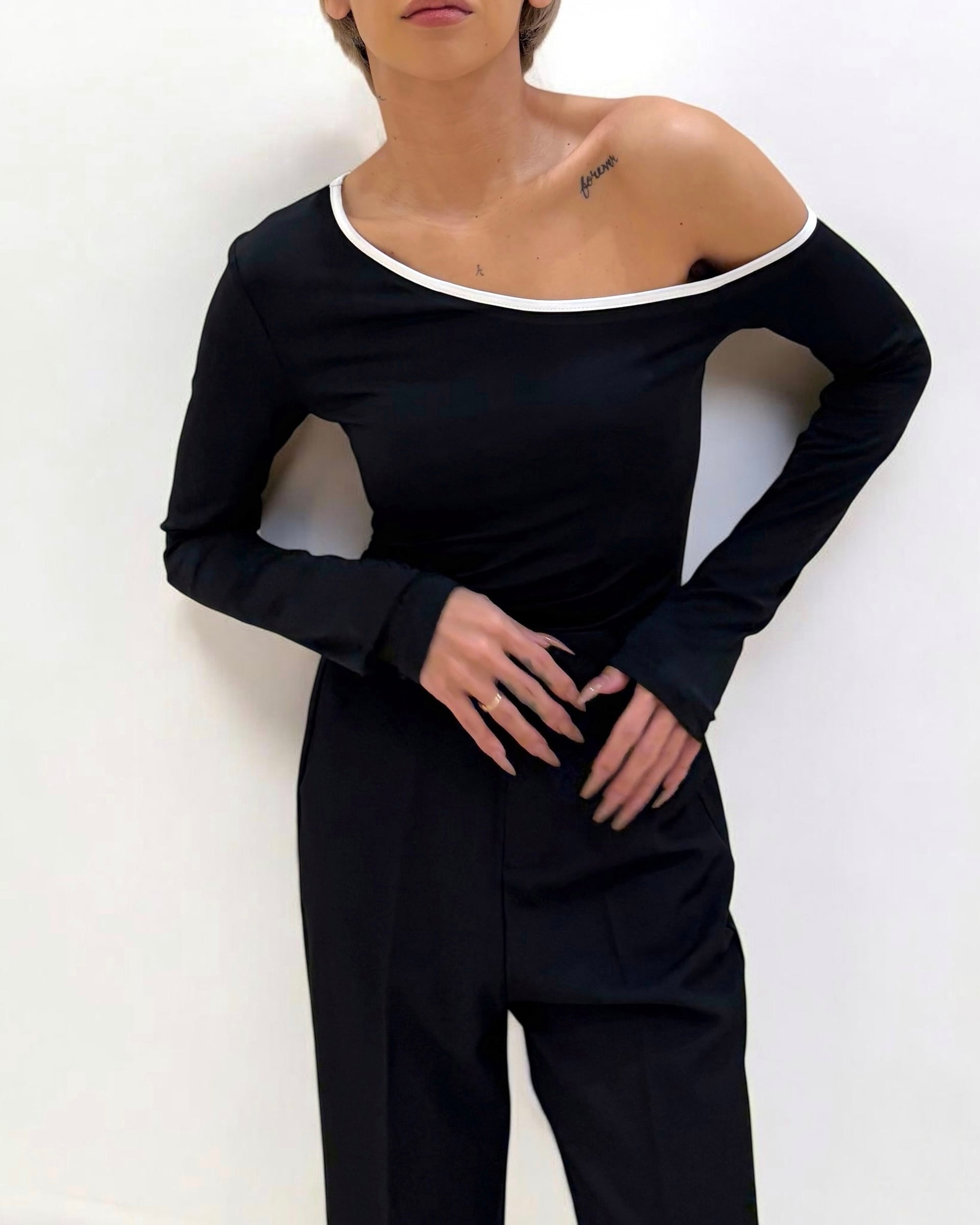 片方の肩を落として着る形のトップスです。
