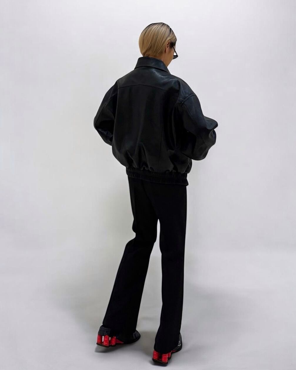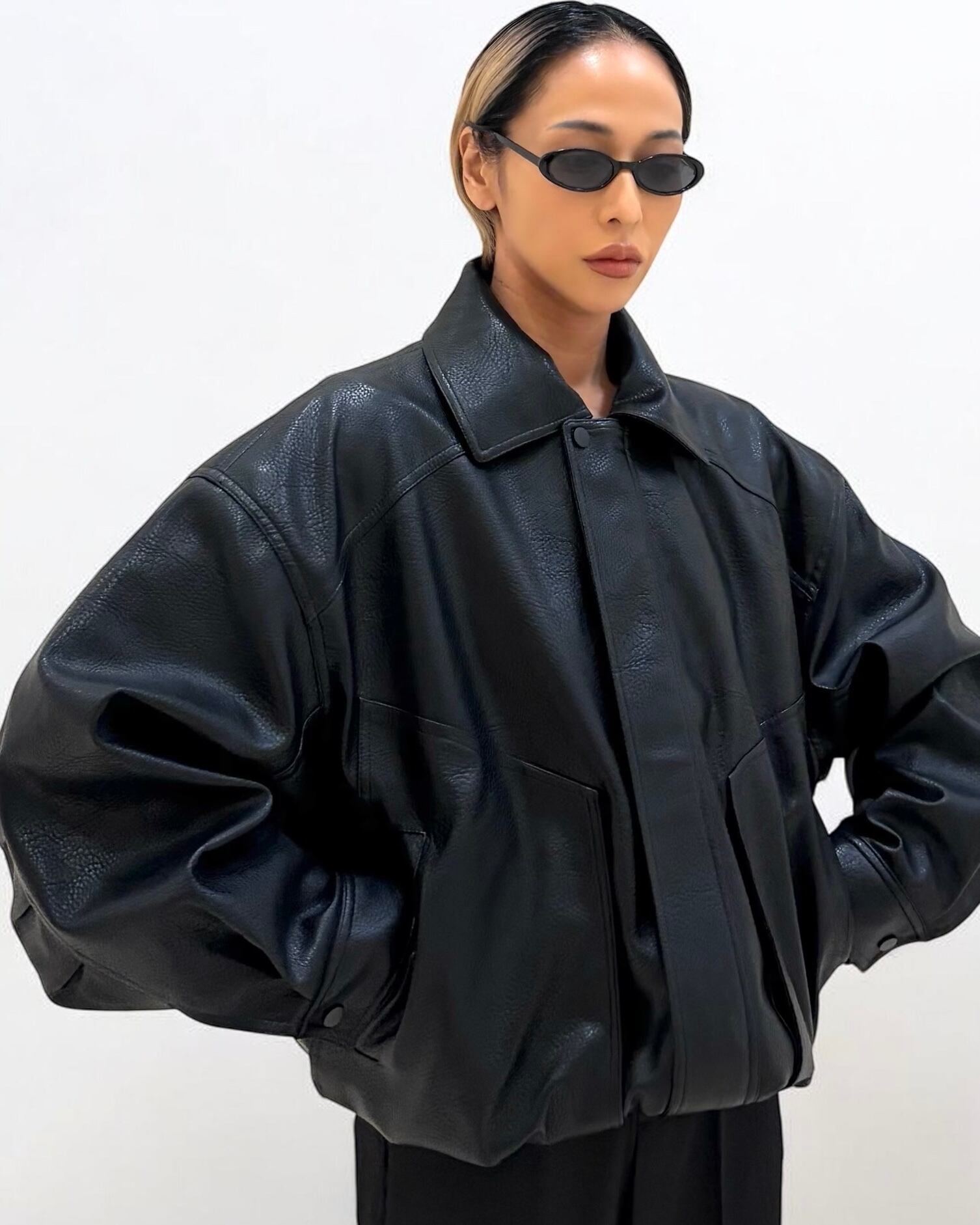 ツヤ感としなやかに体に沿う素材なので、レザー特有の硬さや重さがなくどんなスタイリングにも合う素材とデザインです。