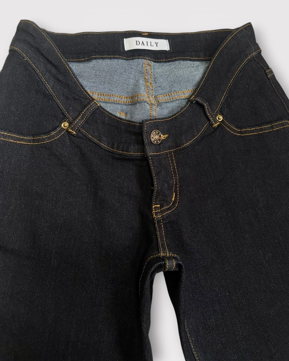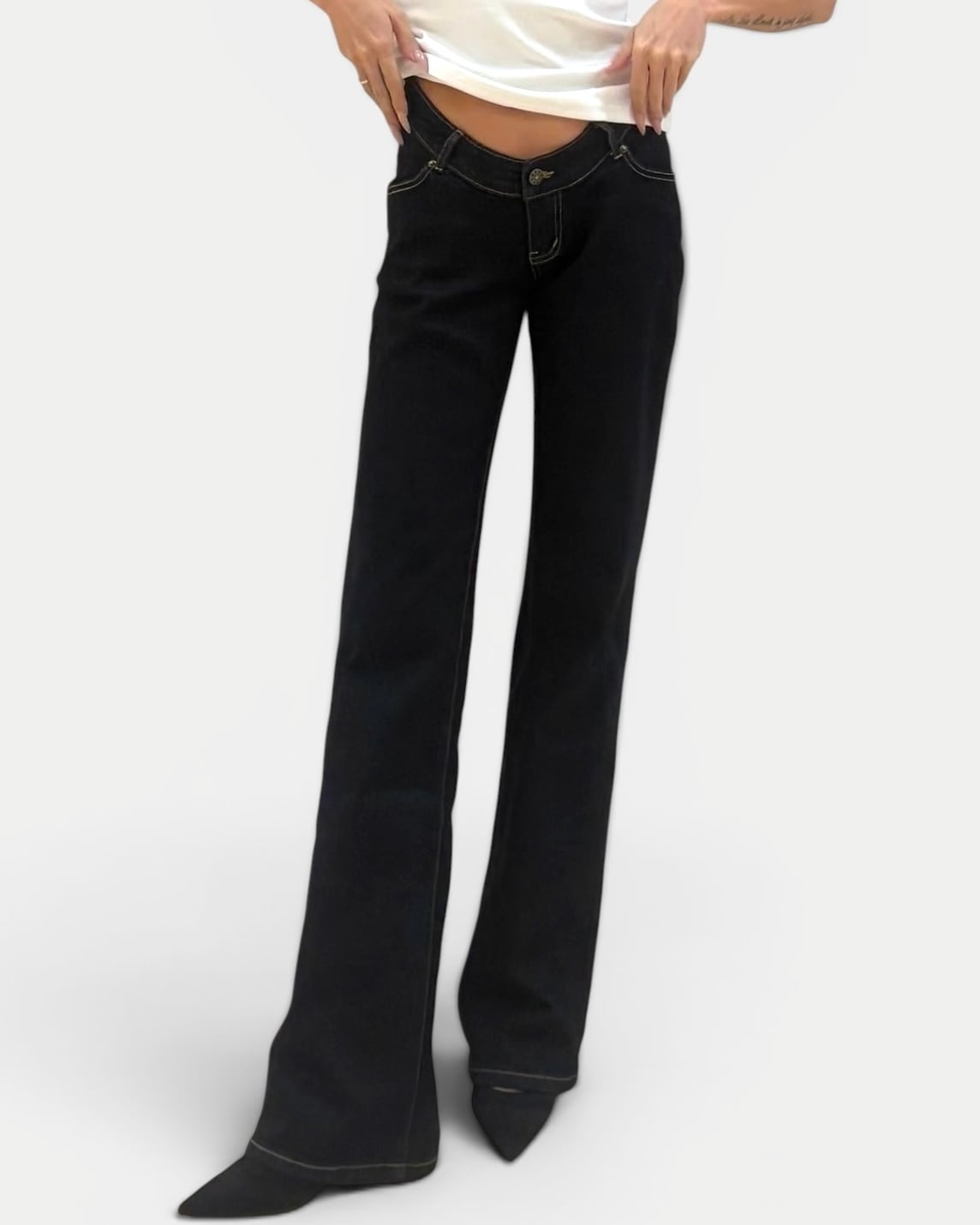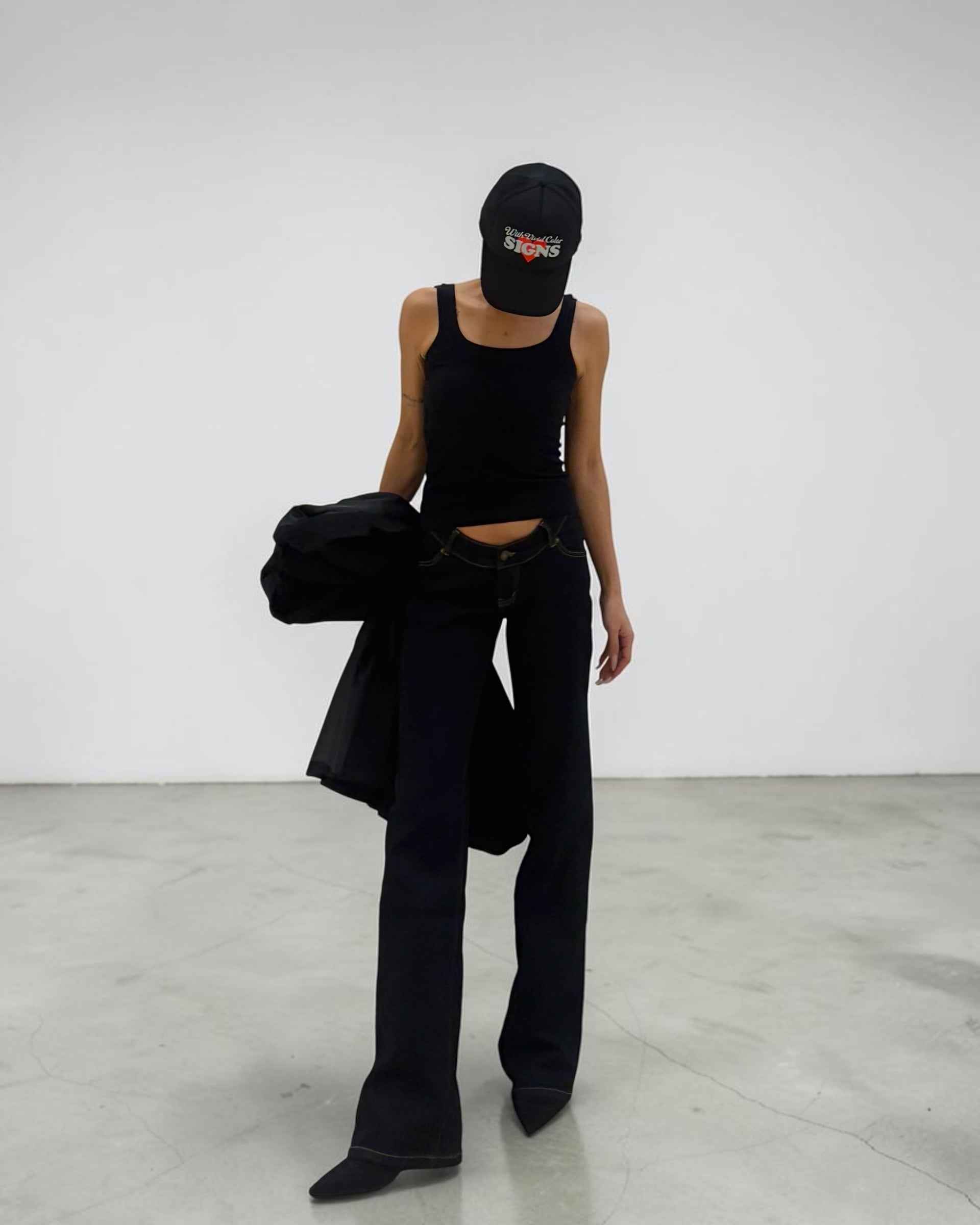フロントをぎりぎりまでウエストを落としたデニムパンツ。